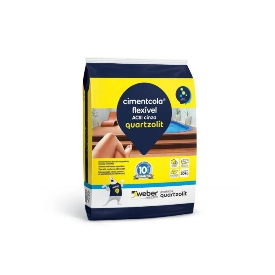 Cimentcola para sobreposição e assentamento de porcelanatos, cerâmicas, mármores, granitos e pedras naturais de uso interno e externo tipo AC III, conforme NBR 14.081. Churrasqueiras, piscinas e saunas. Porcelanatos, mármores, granitos e cerâmicas. Pisos e paredes internas e externas. Revestimentos de até 60 x 60 cm com absorção de água de 0,5% a 6% em fachadas. Revestimentos de até 120 x 120 cm (sobreposição) 140 x 140 cm (base comum). 72 h para rejuntar. 7 dias para liberação total.